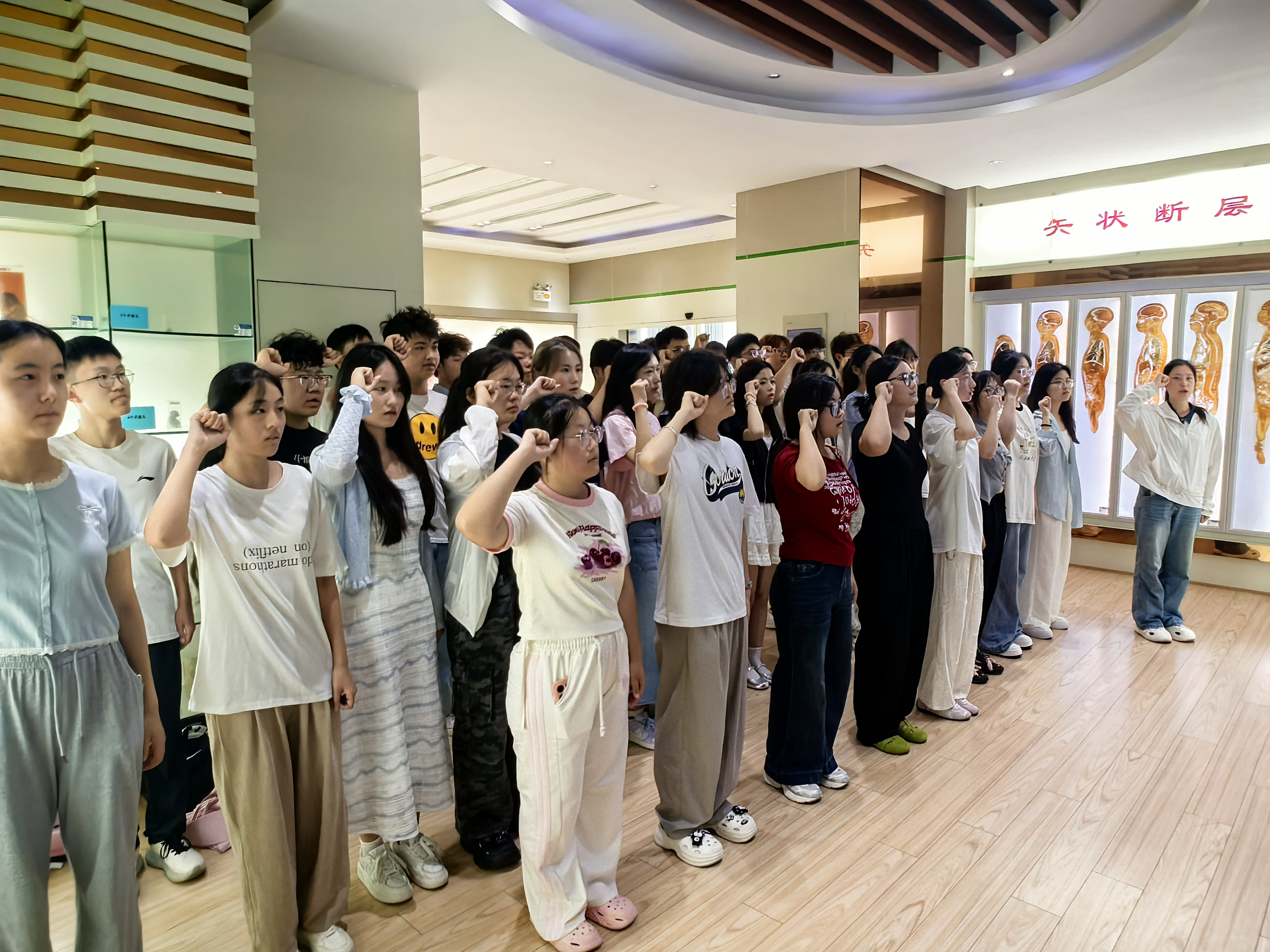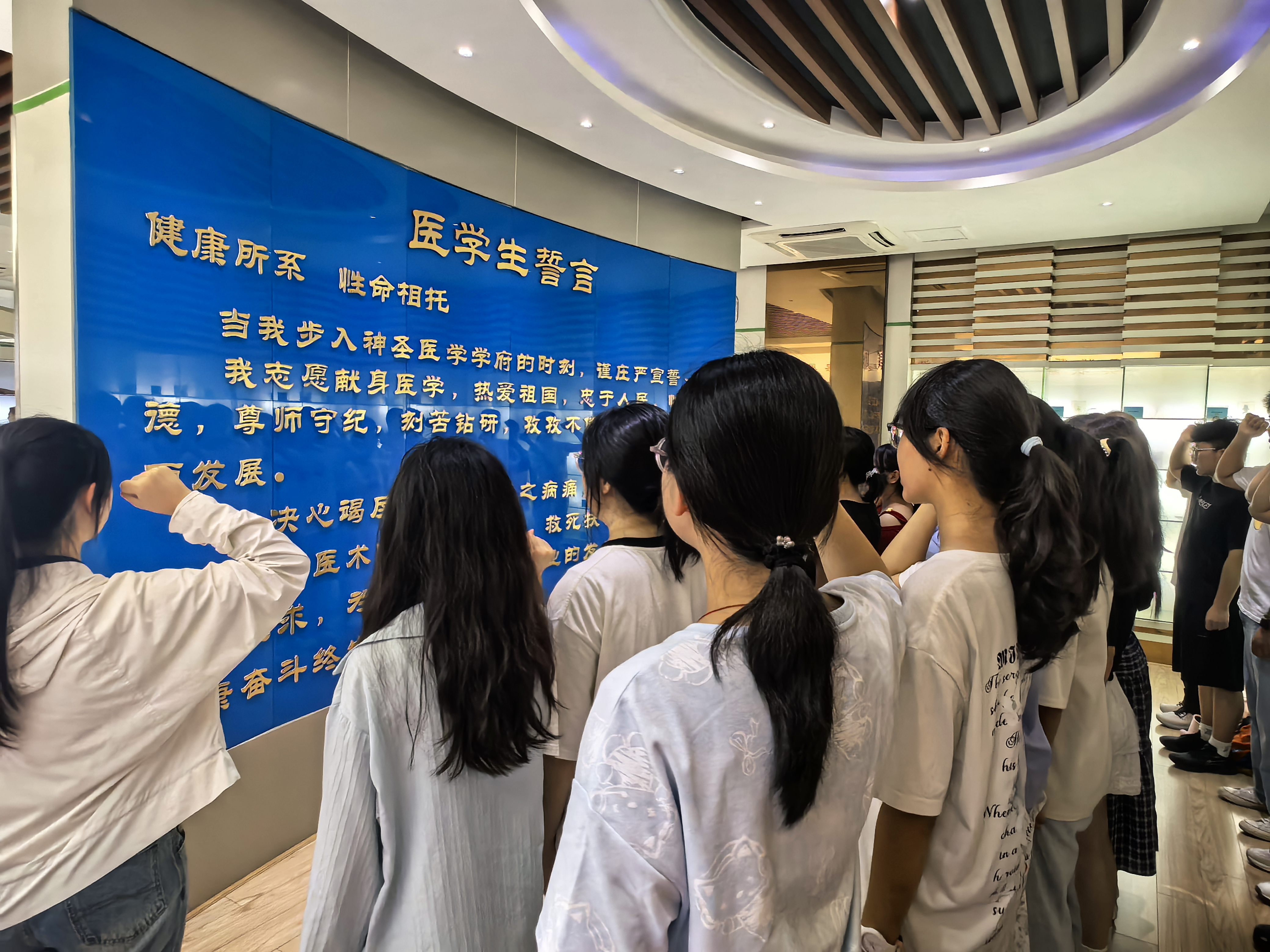 9月12日,430名医学院新生在资深教师夏传余的带领下,参观了生命科学馆。夏老师重点讲解了馆内珍藏的“大体标本”和胚胎发育系列展品,引导新生们感悟生命的崇高与医学的责任。在肃穆的氛围中,全体新生在宣誓墙前庄严举起右手,许下了“健康所系,性命相托”的医学誓言,标志着他们医学事业的正式启航。