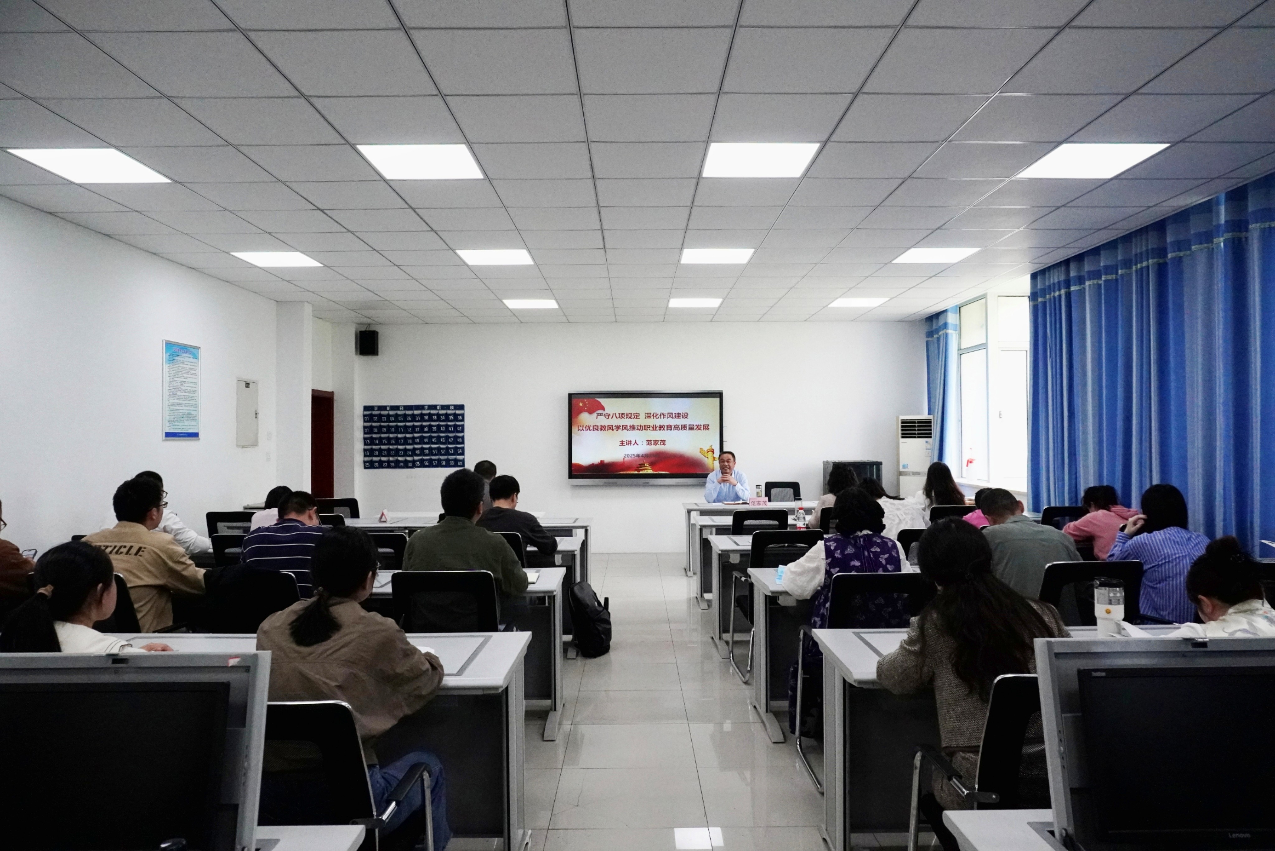 为推动深入贯彻中央八项规定精神学习教育走深走实,持续深化作风建设,推进全面从严治党,4月23日下午,校党委委员、副校长范家茂以《严守八项规定,深化作风建设,以优良教风学风推动职业教育高质量发展》为题,为建筑工程学院全体教职工讲授深入贯彻中央八项规定精神专题党课。